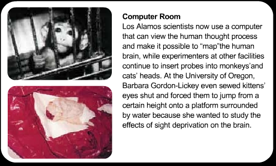 Attēlā, kas nāk no PETA uzturētās stopanimaltests.com lapas, var redzēt cik nekaunīgi PETA sagroza faktus savā labā. Lai uz pāris sekundēm palēnināti modelētu pusi no peles smadzenēm, ir nepieciešams viens no jaudīgākajiem superdatoriem pasaulē – IBM Blue Gene. Cilvēku smadzeņu uzbūve sevī slēpj vēl sarežģītākas struktūras, kuras reproducēt digitālajā vidē pagaidām tehniski nav iespējams.(10) Ja PETA patiešām uzskata, ka ar magnetoencefalogramu[15] ir iespējams skatīt cilvēka domas procesus, viņu priekšstats par prāta darbību sastāv no pāris varavīksnes krāsām, kas miglainos attēlos reprezentē elektrisko aktivitāti smadzenēs.